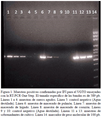 Especificidad de la RT-PCR de VGTO: No se obtuvo amplificación con los controles utilizados correspondientes a los virus de las distintas familias ensayadas, lo que indicó que la técnica de RT-PCR estandarizada es específica para la detección del segmento S del gen de la nucleocápside del VGTO. Estos cebadores detectan todas las cepas conocidas del VGTO.