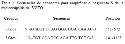 Diseño de cebadores: Se usaron 12 secuencias parciales del segmento S de la nucleocápside del VGTO, depositadas en GenBank (National Center for Biotechnology Information, NCBI, consultado en febrero de 2016), correspondientes a 12 cepas prototipo del VGTO. Mediante el programa BioEdit 7.0.5.3 se realizó la búsqueda de la secuencia consenso. Se empleó el programa Oligo Explorer 1.1.2. para el diseño de los cebadores que amplificaran un fragmento del segmento S de la nucleocápside del VGTO de longitud de 589 pb, según una secuencia consenso y tomando en cuenta los siguientes parámetros: longitud del cebador, temperatura de hibridación, formación de dímeros, contenido de GC y tamaño del amplificado. El alineamiento de las secuencias se realizó con MUSCLE (Multiple Sequence Comparison by Log- Expectation). En la tabla 1 se muestra la secuencia de los cebadores.