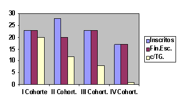 Desde sus inicios en 1994 y hasta el 2002, el programa de maestría en Ciencias de la Comunicación de LUZ ingresó cuatro cohortes. Como se puede observar en el gráfico, de los veintitrés inscritos en la I cohorte el 100% culminó la escolaridad; en la II cohorte se observa que de 28 participantes, 8 no finalizaron la escolaridad. En la III y IV cohorte se inscribieron veintitrés (23) y diecisiete (17) alumnos respectivamente y todos finalizaron la escolaridad. En términos generales, se puede asegurar que los resultados obtenidos del número de participantes que superan la escolaridad para ese período es elevado, reportando un 92%.