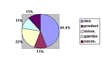 Es apreciable cómo el tema usos de las TIC, con cinco TEG (44.4%), domina la tendencia frente a la innovación, con tres TEG (22.2%) y, por último la productividad, gestión tecnológica y necesidades informativas que aportaron un TEG y obtuvieron 11% cada una.