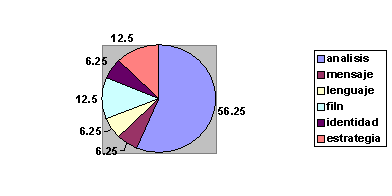 El análisis de contenido textual junto al visual, arrojó un 56.25%, con ocho TEG, resultando el porcentaje mayor comparado con el resto. Mientras que temas como estrategia y films obtuvieron 12.5% cada uno, con dos TEG en cada categoría y un porcentaje menor de 6.25% correspondió a identidad, lenguaje y mensaje, con un trabajo en cada especialidad.