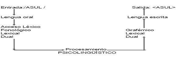 Vamos a tomar como ejemplo la palabra azul. Al ser dictada, es recibida por los órganos receptores y escuchada como asul. El acceso léxico como proceso de reconocimiento lingüístico ya sea de carácter fonológico, dual o léxico, se activa y coteja lo escuchado con su correspondiente huella acústica. En dicho procesamiento se recibe una señal fónica y acústica, en lengua oral. Luego debe ocurrir un proceso de búsqueda, reconocimiento y de cambio. El alumno deberá transformar dicha huella acústica o palabra escuchada en su correspondiente forma escrita, gráfica. Esa huella acústica, lengua oral deberá ser ubicada, encontrada, en una búsqueda psicolingüística, en el almacén escrito, en la huella visual y reconocer como tal, la palabra escrita que corresponda. En nuestro caso, AZUL. De esta manera y explicada de un modo bastante sencillo, ocurre la transformación de la entrada oral a la salida escrita.