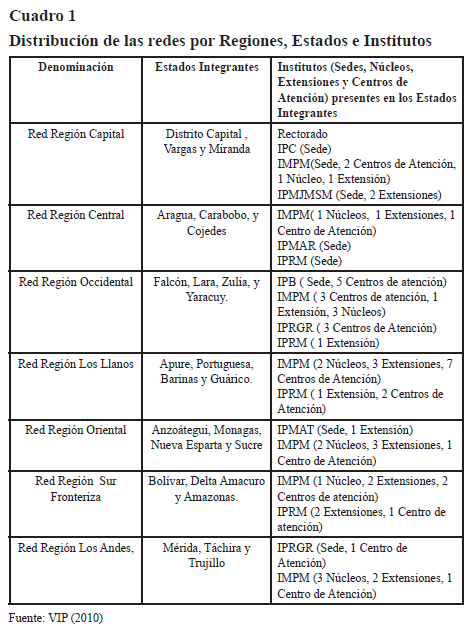 Las siete regiones en las que se discriminan las redes representan cada una características diferentes, por lo que el trabajo de las redes tiene significado sobre todo cuando se están en procesos de Territorialización y Municipalización como los propuestos desde el Ministerio del Poder Popular para la Educación Universitaria, por lo que el conocimiento de estas características coadyuvarían en el ofrecimiento de una oferta de estudios de Postgrado que realmente satisfaga los requerimientos y/o necesidades regionales de ampliación o profundización de conocimientos.