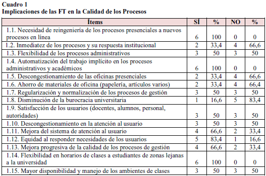 Al observar el cuadro 1 es posible apreciar aquellos aspectos que los entrevistados refieren con mayor impacto en el mejoramiento de la calidad de los procesos de gestión académica administrativa.