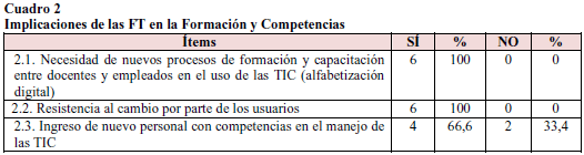 Se aprecia en el cuadro 2 como el 100% de las respuestas afirmativas apuntan a la resistencia al cambio por parte de los usuarios, y de allí que también señalen en un 100% la necesidad de nuevos procesos de alfabetización digital para la comunidad de docentes y empleados. Únicamente, el 66,6% refiere la necesidad de ingresar nuevo personal con competencias adecuadas para el manejo de las TIC.