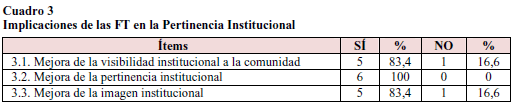 El cuadro 3 refleja que los entrevistados confirman en muy alto porcentaje los planteamientos anteriores, por cuanto el 100% señala las implicaciones en la mejora de la pertinencia institucional que tienen los portales institucionales, y un 84,4% asume la mejora de la visibilidad institucional para la comunidad y, por ende, de la imagen institucional.