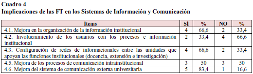 En el cuadro 4 se resalta la importancia que los entrevistados otorgaron a las implicaciones de los portales virtuales en los sistemas de información y comunicación institucional. De esta manera, el 83,4% contestó afirmativamente respecto a la mejora del sistema de comunicación externa universitaria, lo cual se vincula con los planteamientos en los que se ha señalado la mejora en la visibilidad institucional.