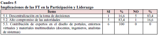 En el cuadro 5 se aprecia una alta valoración para el items incorporación de profesionales expertos en el manejo de las TIC con el 100%. Igualmente, es significativo que los entrevistados refieran el alto compromiso de las autoridades (83,4% de respuestas afirmativas), y esto refleja que la inserción de las TIC en la universidad es una línea estratégica de acción para el alto gobierno universitario. Pese a ello, la estructura burocrática, jerárquica y tradicional que ha caracterizado a nuestras universidades no parece haber sido desplazada con los criterios implícitos con la información y el conocimiento que opera a través de los portales virtuales, de allí que, el 83,4% contestó negativamente respecto al logro de impacto en los procesos de descentralización y liderazgo.