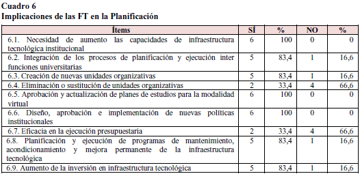 Sin embargo, la incorporación de herramientas tecnológicas como los portales virtuales indiscutiblemente han de generar modificaciones en procesos gerenciales como la planificación. Este proceso no se da en la misma forma en todas las universidades, no obstante, al revisar las respuestas de los entrevistados en el cuadro 6, se visualiza la significación que las universidades le han otorgado al presentar un portal virtual.