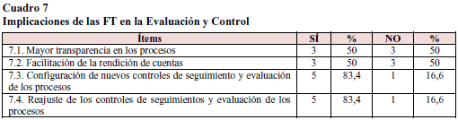 Estas consideraciones resultan significativas en las respuestas de los entrevistados, por cuanto según se aprecia en el cuadro 7, el 83,4% refirió relaciones tanto en la configuración como en el reajuste de los controles de seguimiento y evaluación de los procesos. Por otro lado, es preocupante el resultado sobre la facilitación de la rendición de cuentas y mayor transparencia de los procesos, por cuanto estos criterios fueron reconocidos por el 50% de los entrevistados. Este último aspecto invita a revisar el direccionamiento que los procesos y servicios ofrecidos mediante las FT de los portales universitarios tienen como centro de apoyo a la sociedad de la información, en tanto según lo planteado por Royero (2007), la Universidad debe asumir una filosofía de servicio público dirigida a garantizar el acceso informativo libre y democrático a cualquier ciudadano que desee interactuar con ella, así como mejorar su desempeño hacia un camino de responsabilidad, pertinencia, calidad, transparencia y eficiencia institucional.
