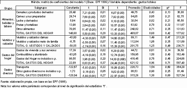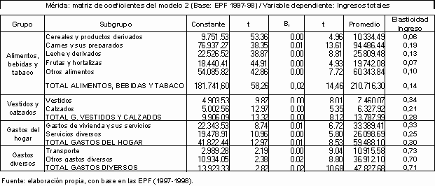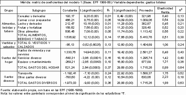 En el caso de los gastos destinados a vestidos y calzados igualmente se registraron valores inelásticos, si bien significativamente mayores a los del caso de los alimentos. Los gastos destinados a la vivienda y sus servicios resultaron ser inelásticos, pero muy cercanos a la unidad (un servicio semi-lujoso), resultados similares a los observados en los casos de los gastos destinados a transporte, a salud y a electricidad. Las restantes categorías de gastos mostraron valores elásticos. Las familias merideñas asignaban la mayor proporción de su ingreso a la vivienda y sus servicios, con 20,83% (exceptuando otros gastos, renglón que por su naturaleza agregativa era el más elevado); le seguían en orden de importancia ropa y equipos del hogar, con 10,40%. En promedio el gasto alimentario representaba el 23,94% del gasto total. Cuando se empleó el ingreso corriente como variable explicativa todos los estimadores resultaron ser estadísticamente significativos y las elasticidades ingreso resultaron mayores que la unidad tan sólo para los casos de ropa y equipos del hogar y de otros gastos.