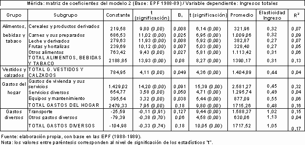 Cuando se estimaron las elasticidades utilizando el nivel de ingresos como variable dependiente (modelo 2, Cuadro 11), los resultados fueron similares. En general la constante resultó estadísticamente significativa a cualquier nivel, excepto para el caso de los subgrupos y del total de los gastos correspondientes a gastos diversos. Sin embargo esta vez los coeficientes de determinación mostraron valores todavía menores que en el modelo 1. De manera similar a los casos de las EPF-1967 y EPF-1986, los coeficientes de elasticidad ingreso resultaron ser todos menores que la elasticidad renta del gasto, en sintonía con lo señalado por Walters (1970). No obstante, en este caso sólo el grupo de gastos diversos mostró coeficientes de elasticidad ingreso elásticos, comportándose en consecuencia (para la muestra ) como los únicos bienes y servicios de lujo.