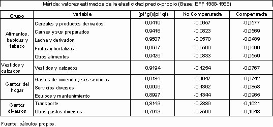 Los valores de elasticidades precio-propio para las diversas categorías del gasto de las EPF 1988-1989 resultaron ser en términos absolutos menores que la unidad, indicando que cada vez que los precios del bien o de la categoría i de bienes y servicios cambiaran en aquel momento en cualquier proporción, inducirían a que los gastos del hogar promedio merideño en ellos variaran menos que proporcionalmente a dicho cambio. Los menores valores correspondieron a los alimentos, grupo en el que el consumidor merideño apenas cambiaba su nivel de gasto alimentario cuando estos bienes experimentaban cambios en sus precios. Los mayores valores de elasticidad precio propio correspondieron a gastos diversos, siendo todos ellos muy inelásticos. Posteriormente cuando se calculó el gasto de subsistencia se pudo constatar que, con respecto a los casos de 1967 y 1988-89, el porcentaje de familias con gastos (totales y por categorías de bienes) por debajo del nivel de subsistencia aumentó significativamente.
