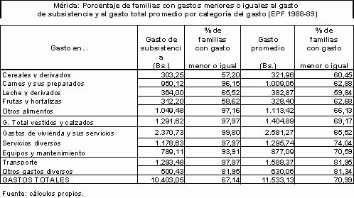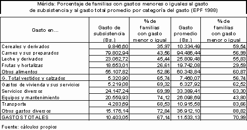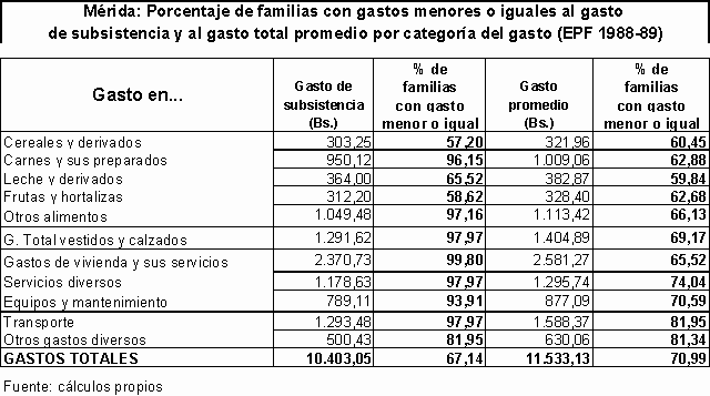 De otro lado, al calcular el gasto de subsistencia los valores obtenidos revelaron que, con excepción de los gastos en vivienda y sus servicios, al menos la mitad de las familias realizaban gastos en todas las restantes categorías por encima de los niveles de subsistencia. Además en 1986 existía una elevada proporción de hogares que efectuaba gastos en cada categoría por encima del promedio muestral de gastos en esa categoría. Debido a la distribución asimétrica negativa izquierda del gasto total de las familias existe la posibilidad de que existiera en aquel momento una proporción importante de familias cuyos gastos correspondían a niveles inferiores, resultados similares a los conseguidos por Belandria en 1970.