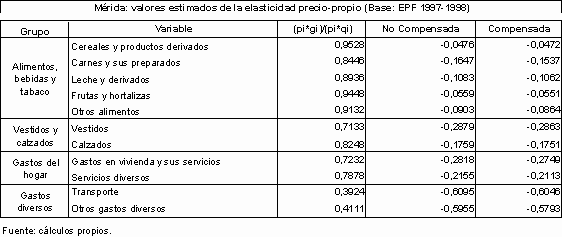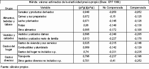 En el caso de la EPF 1986 todas las categorías de gastos correspondientes a alimentación mostraron valores de elasticidad ingreso del gasto menores que la unidad, denotando el carácter de bienes necesarios en el caso de los consumidores merideños. Además, la proporción del gasto en estas categorías resultó casi invariable ante cambios en el gasto total (o ingreso). Los coeficientes de elasticidad precio-propio, tanto no compensados como compensados, mostraron valores negativos y muy cercanos a cero. Esto indica que, en promedio, el consumidor de la ciudad de Mérida no modificaba en aquel momento su asignación del gasto cuando experimentaba fluctuaciones en los precios de los bienes. Los valores compensados resultaron siempre menores que los no compensados.