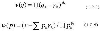 La expresión (I.2.5) se lleva frecuentemente a la forma equivalente x-Sbklog(qi-gi). La forma de utilidad indirecta tiene una interpretación clara en término de gasto real: si los coeficientes g representan requerimientos de subsistencia, solamente (X-Spkgi) es lo que hay disponible para asignar discrecionalmente. Este término se encuentra deflactado por el promedio ponderado de los precios para dar así una medida real del bienestar.