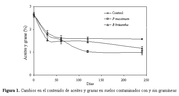 Durante los primeros 60 días, la reducción en el contenido de aceites y grasas fue mayor con B. brizantha , hecho que se correlaciona con la mayor sobrevivencia y producción biomasa en esta especie en la fase inicial, tal como se observó en el primer experimento. A partir del día 60 el suelo con P. maximum mostró una reducción mayor respecto a B. brizantha y el control, lo cual pudiera asociarse con una mejora de la producción vegetal por esta especie una vez que la carga de contaminación ha disminuido en el suelo. Ello también sugiere que P. maximum es más sensible en las etapas iniciales del desarrollo respecto a B. brizantha.