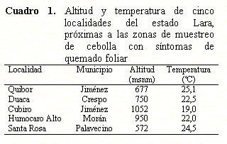 Entre enero y octubre de 1999 se colectaron 22 muestras combinadas de hojas con síntomas de quemado en plantas de cebolla de más de 45 días de edad en 16 localidades de los municipios Jiménez, Crespo, Morán y Palavecino del estado Lara, los cuales presentan diversas altitudes y temperaturas (Cuadro 1). Cada muestra se compuso de 5 a 10 submuestras, tomadas al azar en un recorrido en zig-zag dentro de las parcelas. Las muestras fueron colocadas en bolsas plásticas y transportadas en una cava hermética hasta el Laboratorio de Micología del Posgrado de Fitopatología de la Universidad Centroccidental Lisandro Alvarado (UCLA), en Barquisimeto, estado Lara. Los tejidos sintomáticos de las hojas afectadas se desinfestaron con una solución de hipoclorito de sodio al 1% durante 2 min, luego se colocaron en agua destilada estéril (ADE) y se secaron con papel absorbente estéril. Se incubaron trozos de hojas de aproximadamente 2 cm en cámara húmeda durante 48 h a temperatura de laboratorio (25 ± 2 ºC). La cámara consistió en cápsulas de Petri estériles que contenían dos capas de papel absorbente embebidas en 5 mL de ADE. Los trozos de hojas fueron colocados dentro de la cámara directamente sobre el papel húmedo.
