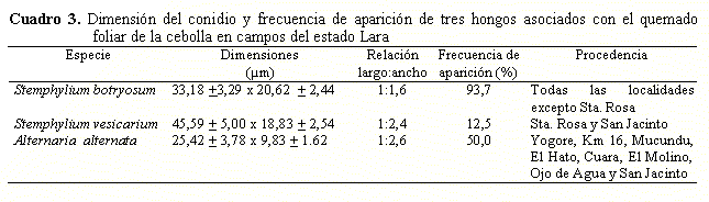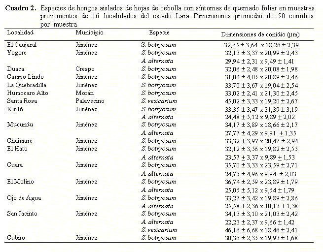 Se detectó la presencia de tres hongos asociados con el quemado de la cebolla en las áreas muestreadas del estado Lara (Cuadro 2). Uno de ellos presentó conidios oblongos, muriformes, de color marrón oscuro y paredes verrugosas, con tres septos transversales, con constricción en el septo central, tamaño promedio de 33,18 ± 3,29 x 20,62 ± 2,44 µm y una relación largo:ancho de 1:1,6, con proliferación a través de un poro en el ápice del conidióforo. Los conidióforos fueron simples, de color marrón, rectos o ligeramente inclinados, con proliferación precurrente, paredes lisas excepto en la parte apical que era abultada y con paredes verrugosas. Estas características coincidieron con las descritas para Stemphylium botryosum Wallroth (Simmons, 1969).
