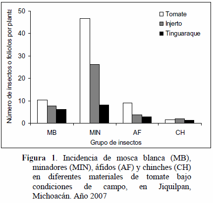 Para determinar la incidencia de insectos en campo, plantas de los tres tratamientos (tomate, Tinguaraque e injerto) de 40 días de edad fueron establecidas en macetas de plástico (17 x 21 cm) y colocadas en condiciones de campo; se consideraron 20 plantas por tratamiento. Se practicaron muestreos entomológicos semanales entre enero y abril de 2007. Para el psilido B. cockerelli y el minador Lyriomiza spp. se registró el número de folíolos con huevecillos y minas, según el caso; para áfidos, mosca blanca, chinches, ninfas y adultos del psilido se registró el número de individuos por planta.