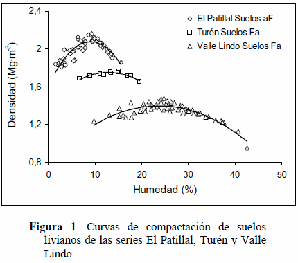 En la Figura 1 se muestran las curvas de compactación de los suelos pertenecientes al grupo de texturas gruesas o livianos, se aprecia como los suelos aF de la serie El Patillal presentan niveles más altos de densidad alcanzados a niveles más bajos de humedad en comparación con los suelos Fa de Turén y Valle Lindo.