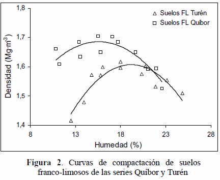 El nivel de presión logrado mediante la prueba del Proctor estándar es comparable con las presiones de 0,2 a 0,24 MPa ejercidas por los pases sucesivos de un tractor de rueda con peso promedio de 2500 a 2900 kg y con superficie en las cuatro ruedas de 1200 cm2 (Raghavan et al., 1976). En este sentido, los valores de humedad crítica encontrados en este estudio pueden ser considerados como referenciales a objeto de recomendar no introducir maquinaria agrícola al campo cuando la humedad del suelo se encuentre cercana o superior a estos valores, debido a que aumentarían los riesgos de compactación.