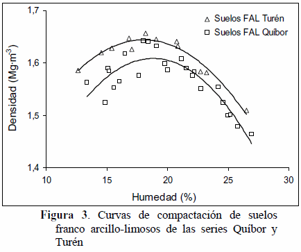 En las curvas de compactación de suelos de las series Turén y Quíbor (Figura 2) se puede apreciar como los suelos FL de Quíbor alcanzan mayores valores de densidad que los suelos FL de la serie Turén. Este resultado probablemente está relacionado con un mayor porcentaje de partículas gruesas de la serie Quíbor en comparación con la serie Turén. Por otra parte, en la Figura 3, donde se muestran los suelos FAL de las mencionadas series, se aprecia que las curvas son muy similares, presentando los suelos FAL de Turén valores de densidad máxima ligeramente más altos que los de la serie Quíbor, lo cual se asocia con mayores contenidos de partículas finas de los suelos FAL de la serie Quíbor, y que incide en que éstos logren valores más bajos de densidad a mayor contenido de humedad.