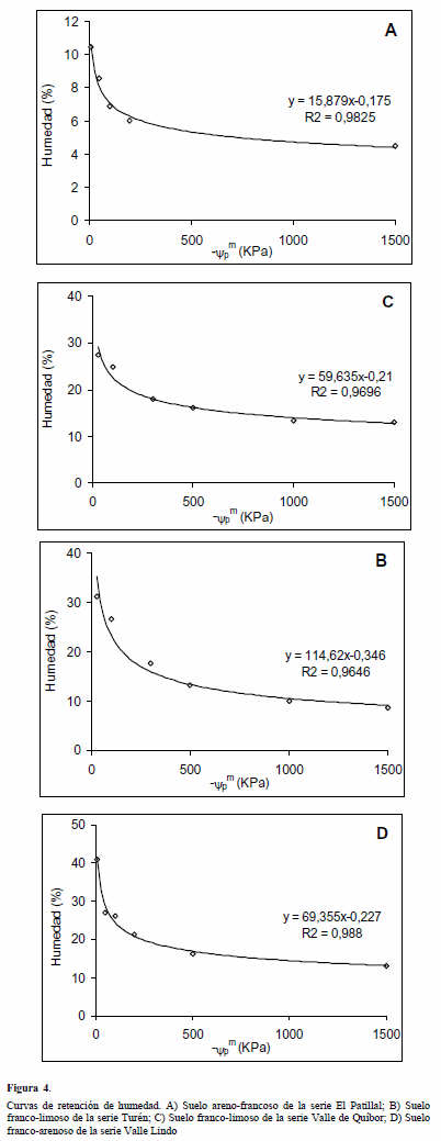 En la curva de retención de humedad de los suelos representativos de la serie El Patillal y su ajuste a una ecuación potencial (Figura 4A) se aprecia como la ecuación describe el comportamiento de la curva presentando un alto valor de coeficiente de determinación (R2 = 0,98) e indicando una alta capacidad predictiva de la ecuación. En este sentido, utilizando la ecuación generada y=15,879x-0,175 se estimó el potencial correspondiente al contenido de humedad crítica al despejar el valor de x (x=7166287,9y-5,71) y se encontró un potencial de 25 kPa. Este resultado muestra como el contenido de humedad crítica de los suelos de la serie El Patillal está muy cerca del punto de saturación (yp=0). Esta respuesta está relacionada con la propiedad que poseen los suelos arenosos de retener el agua a bajos niveles de tensión presentando un ámbito muy reducido de los contenidos de humedad que éstos pueden almacenar; por esta razón, el porcentaje de humedad correspondiente a la máxima densidad se encuentra cercana al punto de saturación.