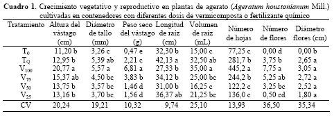 A pesar de que el uso de la vermicomposta se ha extendido en los últimos años, es necesario incrementar la evidencia científica acerca de las bondades de su uso en diferentes cultivos ornamentales, por lo que se realizó el presente estudio cuyo objetivo fue evaluar el efecto de la vermicomposta como componente de sustrato o como único medio de crecimiento en el cultivo en contenedor de dos especies de importancia económica, como son agerato y petunia.
