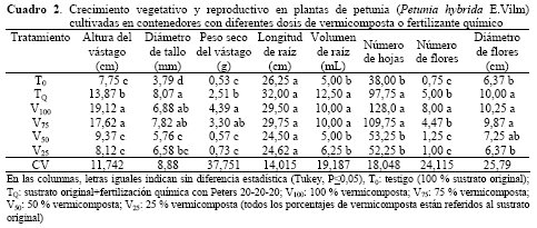 El número de flores, tanto en agerato como en petunia, disminuyó uniformemente a medida que disminuyeron las dosis aplicadas de vermicomposta, desde un valor máximo en las plantas cultivadas directamente sobre este compuesto orgánico (V100) hasta un mínimo en la dosis menor (V25). Incluso, no hubo flores en el tratamiento testigo de agerato. El tratamiento químico tuvo una respuesta similar al de las dosis intermedias de vermicomposta (Cuadros 1 y 2). Estos resultados son similares a los de García et al. (2010) quienes encontraron que la máxima dosis de vermicomposta (80 %) en el cultivo de petunia produjo el mayor número de flores por planta. Sin embargo, nuestros resultados son contrarios a lo señalado por Chamani et al. (2008) y Arancon et al. (2008) quienes mencionaron que, si bien la adición de vermicomposta al sustrato en la producción de petunia ocasionaba un incremento en el número de flores por planta, las dosis debían estar entre 20 y 40 % del volumen total del contenedor, ya que con dosis superiores ocurría un efecto contrario.
