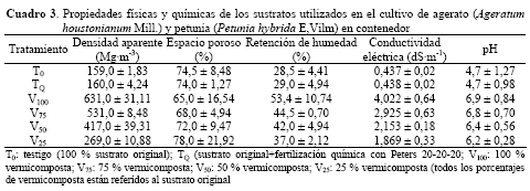 Con respecto a la raíz, en agerato, el tratamiento químico produjo raíces significativamente (P≤0,05) más largas que los demás tratamientos, a la vez que se observó un posible efecto negativo de la vermicomposta ya que el crecimiento de la raíz tendió a disminuir mientras mayor fue su concentración en el sustrato (Cuadro 1). En petunia no se encontraron diferencias significativas (P>0,05) entre tratamientos (Cuadro 2). Por otro lado, el tratamiento químico y el V100 superaron al resto de las dosis de vermicomposta incluyendo al testigo en el volumen de raíz de agerato; esos mismos tratamientos, más el V75, produjeron similares efectos en el volumen de raíz de petunia. De lo anterior se deduce que la vermicomposta no logró incrementar la longitud de las raíces pero sí el volumen de las mismas, en ambas especies (Cuadros 1 y 2). Resultados comparativos sobre el volumen de la raíz han sido encontrados al aumentar las dosis de vermicomposta en tomate (Villa-Briones et al., 2006). El crecimiento de las raíces está relacionado con la porosidad del sustrato (Díaz et al., 2004); en este trabajo, la mayor longitud de raíz del agerato estuvo asociada a los sustratos con la menor concentración de vermicomposta, es decir, los mismos que presentaron el mayor espacio poroso (Cuadro 3).