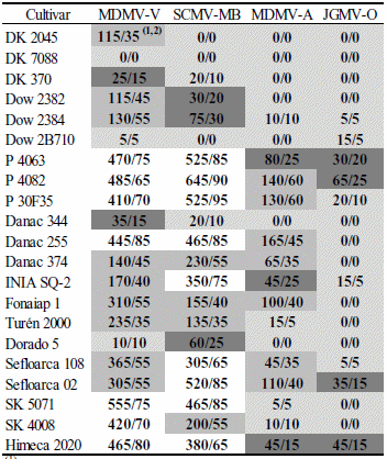 Los cultivares con el mejor comportamiento ante las cuatro razas virales fueron DK 7088, DK 370, Dow 2B710, Danac 344 y Dorado 5.