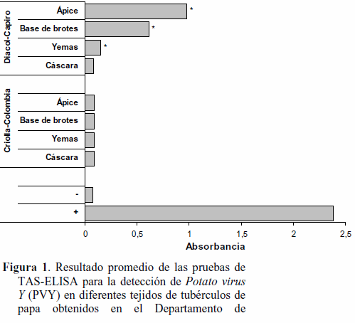 Para el caso de las muestras de tubérculos de la variedad Criolla-Colombia (S. Phureja), las pruebas de TAS-ELISA no detectaron el PVY en ninguno de los tejidos evaluados, obteniéndose valores de absorbancia a 405 nm inferiores a 0,0875 (SDs=0,01) para todos las muestras bajo análisis, independientemente del tejido (Figura 1).