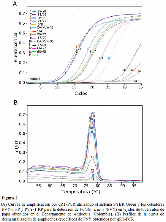 La definición de los porcentajes de incidencia viral en lotes de semilla se fundamenta en la inspección visual de síntomas foliares en el campo y eventualmente en algunos países o regiones, esto puede estar acompañado de un número limitado de pruebas de ELISA para virus de importancia económica como PVY y PLRV. Sin embargo, dichas metodologías serológicas tienen restricciones de sensibilidad que no permiten la detección de virus en tejidos con bajo título, como los presentes en tubérculos en latencia (Agindotan et al., 2007; Halterman et al., 2012). En contraste, los métodos de detección viral basados en ácidos nucleicos como RT-PCR convencional (Singh y Nie, 2003; Lorenzen et al., 2006) y RT-PCR en tiempo real (qRT-PCR) (Agindotan et al., 2007; Fageria et al., 2013; Singh et al., 2013) son altamente sensibles, de rápida ejecución y permiten la detección simultánea de diferentes virus cuando se realizan en formatos multiplex (Crosslin y Hamlin, 2011). En los últimos años, para la detección de virus de plantas, incluyendo PVY, se destaca el uso creciente del qRT-PCR dada su eficiencia en tiempo, gran especificidad, altos niveles de sensibilidad y reducción del riesgo de contaminación entre muestras, al no requerir de manipulaciones post-PCR (Mumford et al., 2000; Fageria et al., 2013; Vanegas-Berrouet et al., 2014).