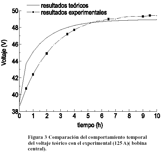 Los resultados teóricos fueron comparados con datos recopilados en series de mediciones experimentales, realizadas durante la etapa de prueba del imán del tomógrafo Giroimag03 en el CBM, en el proceso llamado Prueba de Estabilidad Térmica, que se efectúa para verificar el estado técnico del imán, evaluar el montaje de los elementos de las bobinas y determinar el régimen de explotación óptimo para el equipo. No es posible comparar los resultados teóricos de distribución de temperatura en el interior del enrollado con resultados experimentales, pues como se explicó no se cuenta con la tecnología que permita colocar sensores internos para medir estos valores. La comparación se efectuó para distintos valores de corriente, atendiendo sobre todo a los voltajes teóricos y experimentales, para cada bobina por separado y para todo el imán, pues éste es el parámetro más representativo de la temperatura promedio del alambre. Las Figuras 3 y 4 muestran la similitud del comportamiento teórico del voltaje con el experimental, para una bobina y para el imán en su conjunto.