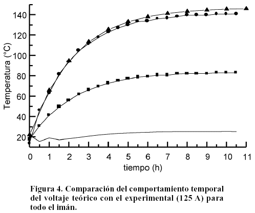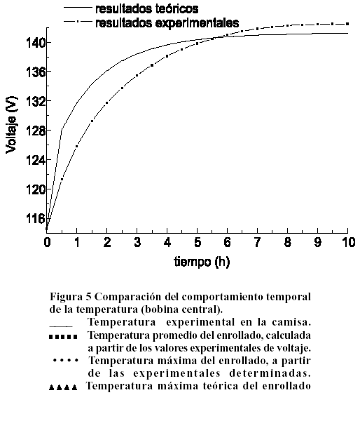 En la Figura 5 se muestra la curva de comportamiento temporal de la temperatura máxima del enrollado, deducida de los valores experimentales, con la curva de temperatura máxima obtenida teóricamente. Resulta evidente la existencia de gradientes de temperatura en el interior del enrollado y que las temperaturas máximas teóricas coinciden en gran medida con los valores de temperatura máxima calculados a partir de los experimentales promedio y mínimo, tomando este último como el de la camisa, por ser una zona donde se encuentran los conductos de agua y tener en consecuencia menor temperatura.