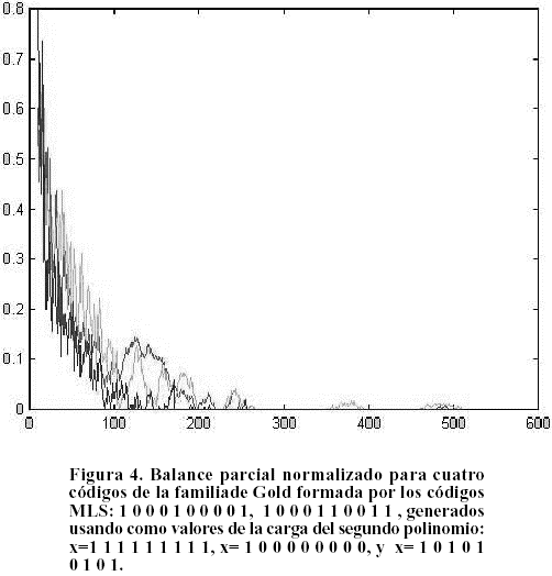Es imprescindible para el diseñador asegurarse cuál es la cota máxima del balance de los códigos de la familia que se va a usar en el sistema CDMA La forma empírica más sencilla es representar la función de balance normalizado para todos los códigos que se usarán en el sistema. Al evaluar el balance parcial para todos los códigos MLS y todos los de Gold útiles, de la familia de orden 9, se obtuvo la siguiente tabla de valores de dicho balance normalizado con respecto a los valores de N.