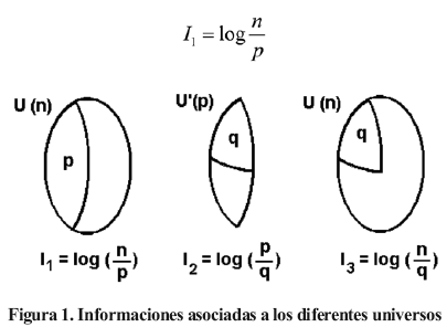La información que recibe, y que permite acotar a q elementos el conjunto de p elementos dentro de un universo U (centro en figura 1), se denominará I2 y será: