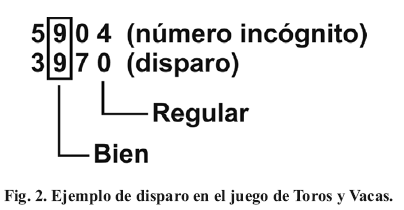 Cada jugador debe informar, una vez efectuado el disparo, cuántos dígitos se encuentran en el número seleccionado y si están o no en la posición correcta. De estar en la posición correcta, estos dígitos se denominan Toros o Bien (B). Por lo contrario, si están en el número pero fuera de posición, se les denomina Vacas o Regular (R). Supóngase que, por ejemplo, el segundo adversario, dispara el 3970. La Figura 2 muestra qué ocurre en el ejemplo.