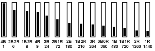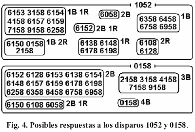 Como se observa en la Figura 4 (arriba), el disparo 1052 puede originar 7 posibles resultados (1B 1R, 1B 2R, 1B, 2R, 2B 1R, 2B y 1R) asociados a igual número de subconjuntos, mientras que el disparo 0158 (Figura 4, abajo) sólo lo fracciona en 4 subconjuntos. Dado que la próxima pregunta (o disparo) tomará como base de partida el subconjunto asociado con la respuesta que se obtenga del disparo actual, se inclina, intuitivamente, a considerar como superior el disparo 1052 al 0158 por realizar un fraccionamiento mayor. O sea, el hecho de poder recibir una mayor diversidad de respuestas, satisfactorias a su vez para un número más reducido de elementos, resulta cualitativamente superior.
