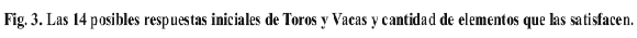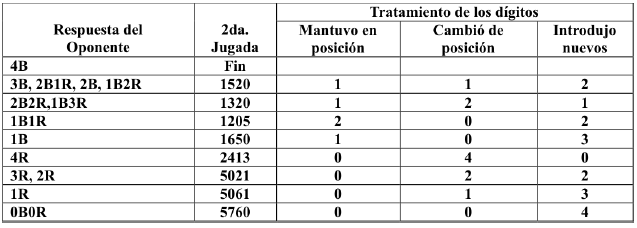El segundo adversario, a su vez, selecciona también un número incógnito para que el primero lo descubra con igual procedimiento. Gana, desde luego, el que descubra el número de su oponente con la menor cantidad de disparos. El total de posibles números a seleccionar es 5040, ya que hay 10 posibles elecciones para el primer dígito, 9 para el segundo, 8 para el tercero y 7 para el cuarto (5040 = 10 x 9 x 8 x 7). La Figura 3 muestra las 14 posibles respuestas, la cantidad de elementos que las satisfacen inicialmente y una representación grafica de la información aportada por cada una. En lo adelante, todos los logaritmos se considerarán con base 5040.