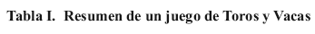 Considérese el ejemplo resumido del juego de Toros y Vacas que se muestra en la Tabla I donde el número incógnito es 6958.