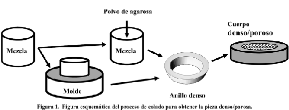 Una porción de la mezcla (suspensión de alúmina+agarosa) preparada de acuerdo al procedimiento descrito en la Etapa I fue colada en un molde flexible con forma de anillo para conformar la zona densa, mientras que a otra proporción se le adicionó polvo de agarosa sin disolver, como agente formador de poros, en concentraciones de 3%, 4,5% y 6% respecto al peso seco de Al2O3, y colada dentro del anillo que constituye la zona densa ya elaborada (Figura 1). Para evitar la aglomeración del polvo de agarosa y permitir una distribución uniforme de este aditivo y por consiguiente de poros, se emplearon dos técnicas: vibración mecánica y agitación magnética y mecánica simultánea. Mediante la caracterización microestructural preliminar se determinó que la distribución de polvo de agarosa en la suspensión empleando la vibración para dispersarlo no es adecuada, por lo que la técnica empleada para este fin fue la agitación magnética y mecánica simultánea.