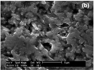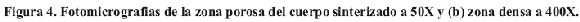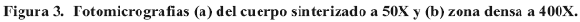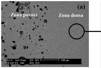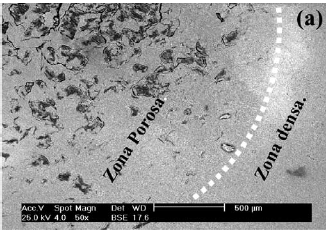 Las fotomicrografias de la Figura 3 corresponden a un cuerpo sinterizado obtenido a partir de una pieza en verde con las características de la mostrada en la Figura 2. En la micrografía 3a se distingue claramente una zona densa y una zona porosa sin la existencia de un plano de interfase, que debería estar presente ya que fueron coladas en tiempos distintos. Esta característica se debe a la retención de agua por parte de la agarosa disuelta, lo que permite la misma concentración de humedad en ambas zonas, logrando así una perfecta adherencia entre ellas. Si bien es cierto que en la micrografía 3b, correspondiente a la zona densa, se observa una porosidad significativa en el cuerpo, los resultados del análisis cuantitativo realizado sobre micrografías a un aumento de 400X, reportan que la fracción volumétrica de los poros es de 9%, lo cual indica que la densificación de esta zona es de un 91%, con poros de diámetro promedio de 1,40 ± 0,01 m y un diámetro máximo de 2,30 ± 0,01 m. Esto era de esperarse, ya que por razones técnicas la temperatura de sinterización fue de 1450 ºC, inferior a la temperatura de sinterización para este tipo de materiales que normalmente es del orden de 1500 °C, reportada por autores que han logrado porcentajes de densificación cercanos al 98 % [26].