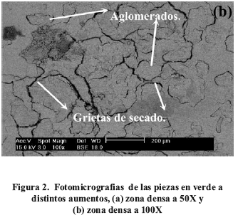 En la Figura 2 se observan las fotomicrografias del cuerpo denso/poroso en verde, con una concentración de 6% de agarosa, agregada en forma de polvo mediante la técnica de agitación mecánica y magnética simultánea, que corresponde a la zona porosa. Se observa una buena distribución de este aditivo, y una zona sin agarosa que corresponde a la zona densa. En la micrografía 2a se observa claramente la zona densa y la zona porosa sin la existencia de una interfase entre ellas, como normalmente ocurre con otros métodos de conformado, que debido a que la diferencia de humedad crea un plano que puede llegar a separar parcial o totalmente las partes. La micrografía 2b corresponde a la zona porosa a mayor magnificación, en esta se puede observar la existencia de aglomerados producidos por la agarosa agregada en polvo, la que a la vez es la causante de las grietas entre los aglomerados, ya que las disoluciones de agarosa al secar se contraen fuertemente (disoluciones a 3 % en peso contraen 80 %) y se incrementa a medida que la concentración disminuye [26].