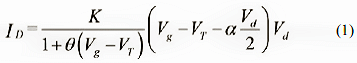 VG es el voltaje de compuerta extrínseco, VD es el voltaje de drenador extrínseco, R es la Resistencia de drenador-surtidor, θ es el factor de degradación de movilidad, α es el factor de efecto de carga de cuerpo y K es el parámetro de conducción. Los demás parámetros mantienen su significado usual.
