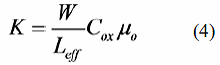 W es el ancho del canal, μo es la movilidad de los portadores, Cox es la capacitancia por oxido de compuerta y Leff es el largo efectivo de canal. Substituyendo la definición del largo efectivo de canal Leff = Lm - ΔL , donde ΔL denota el acortamiento de largo de canal, y la ecuación (12) de Ko en (4) encontramos:que es una expresión de la conductancia de canal