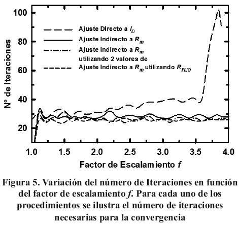 <2.25. Para un valor superior a 2.25 el número de iteraciones que requiere el Ajuste Directo a ID comienza a aumentar sostenidamente presentando un crecimiento abrupto para f=3.5, comportamiento que se mantiene hasta f=3.89 cuando el procedimiento deja de converger.Por su parte, para los procedimientos de Ajuste Indirecto a Rm, Ajuste Indirecto a Rm utilizando dos valores Lm y Ajuste con aproximación de R a un valor RFIJO constante, el número de iteraciones presenta fluctuaciones alrededor de 25 iteraciones y el mayor valor de f al cual estos procedimientos convergen a los parámetros correctos es f =6 para el Ajuste Indirecto a Rm y f =23 para el Ajuste Indirecto a Rm utilizando dos valores de Lm. Respecto al procedimiento de Ajuste con aproximación de R a un valor RFIJO constante, se verificó que para un factor de escalamiento f superior a 1000 aún se logra extraer de forma correcta los parámetros.