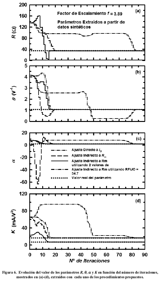 Debido a que la convergencia de los ajustes es inmediata cuando el valor inicial de iteración es el valor esperado, se utilizó para esta prueba un factor f =3.89, ya que tal como se presentó en la sección anterior corresponde al máximo valor de f al cual el procedimiento de Ajuste Directo a ID converge. Los resultados de esta prueba se presentan en la Figura 6 de (a)-(d) para R, θ, α y K respectivamente, indicando con línea punteada el valor correcto de cada uno de ellos. Para el parámetro K se utilizaron dos valores diferentes: K =16.8 mA/V2 correspondiente al valor de convergencia de los procedimientos de Ajuste Directo a ID, de Ajuste Indirecto a Rm y Ajuste con aproximación de R a un valor RFIJO constante, y K =7.03 mA/V2 para el procedimiento de Ajuste Indirecto a Rm utilizando dos valores de Lm, calculado con los valores de Ko y ΔL.