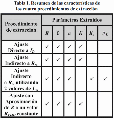 Para todos ellos se logra la comprobación del modelo con datos sintéticos, ya que los valores de los parámetros extraídos se corresponden con los valores utilizados para la generación de los datos. Al ser aplicados sobre datos experimentales también se logra realizar la extracción, hecho comprobado gráficamente al observar la coincidencia entre las curvas experimentales y las curvas de validación calculadas a partir de los parámetros extraídos.